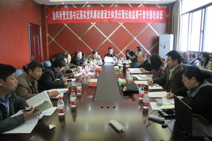 3月27日,在油料所阳逻基地综合楼,油料所举办了党支部落实党风廉政建设主体责任暨纪检监察干部专题轮训班。所长、党委书记王汉中委托副所长、党委副书记李光明主持会议,所属各党支部书记、所纪检监察干部、党办相关工作人员参加了培训。