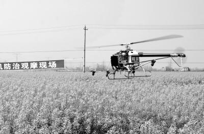 3月27日,中国农科院油料所、湖北荆州市农科院、公安县农业局共同在公安县夹竹园镇观音寺村联合举办飞机喷药防治油菜菌核病现场会,通过无人驾驶小型直升机,仅用半小时左右便完成了200亩的油菜示范地喷药作业。