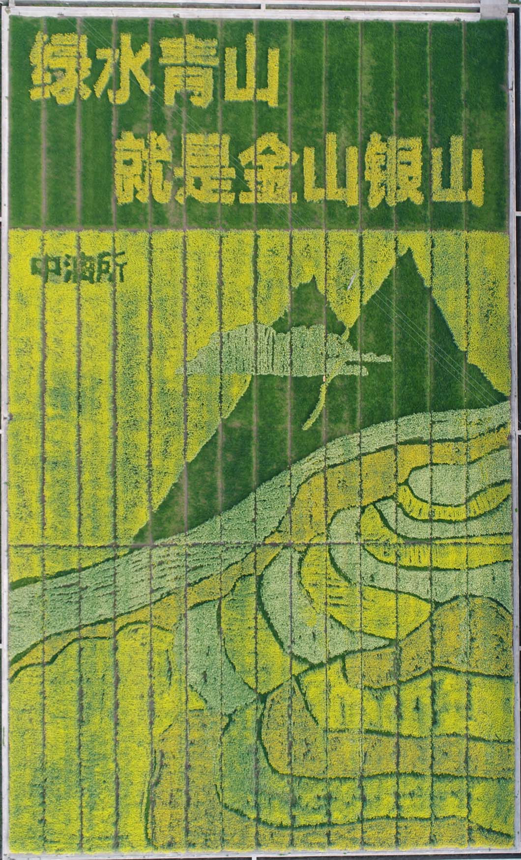 日前,在中国农科院油料所阳逻基地油菜创意试验田中惊现一幅巨型山水画,画中高山、白云、河流、梯田和谐统一,“绿水青山就是金山银山”的大字清晰可见。这是油料所油菜种质资源创新团队、基地办联合江汉大学生命科学院设计的多彩油菜景观。
