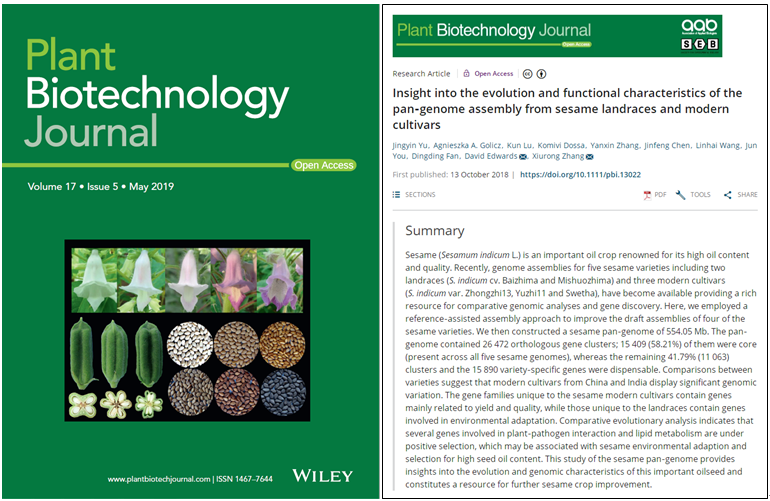 近日,油料所芝麻与特色油料遗传育种创新团队成功揭示了芝麻地方品种和栽培品种泛基因组特性及演化规律,为芝麻种质资源的收集和利用、芝麻分子选择辅助育种提供了重要的基因资源和理论指导。该项研究成果在国际知名学术刊物《植物生物技术》(Plant Biotechnology Journal)以封面文章形式在线发表。