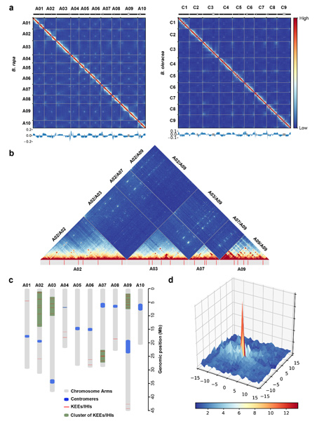 白菜和甘蓝等芸薹属植物是研究基因组进化的理想模型。白菜和甘蓝由共同的六倍体祖先分化而来,两者基因组序列非常保守,其保留下来的同源基因具有偏好性。探明同源基因的偏好性机制对于研究芸薹属物种基因组进化具有重要意义。该团队通过鉴定比较白菜和甘蓝的不同层次的染色质三维结构,发现两者的染色质结构非常保守,并与基因表达和表观修饰存在密切联系。研究发现,在白菜和甘蓝中拥有基因数量更多的亚基因组的染色质交互更强,更易保留下来的同源基因对之间的染色质交互频率更高,表明进化中保留下来的同源基因具有空间邻近的特征,该项成果为芸薹属基因组进化研究提供了新思路。