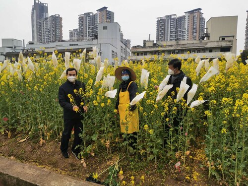 在油料所阳逻基地油菜试验地里,试验科研人员佩戴着口罩,熟练地完成油菜去杂、套袋等一系列田间工作。来自油菜遗传育种、植物保护、耕作栽培、基因组学等多个团队的40多名科研人员分别在阳逻、武昌试验基地开展科研生产。