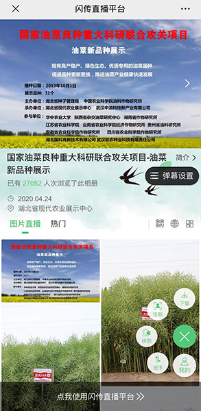 5月1日,由中国农科院油料所主办的国家油菜良种重大科研联合攻关项目2019-2020年度油菜新品种“云观摩”会成功举办,通过网络直播形式在线展出了攻关项目组选育的31个适宜机械化生产、高含油量、高油酸、抗根肿病等特性的油菜新品种的长势长相。不仅有每个品种高清晰度照片,还有优良特性介绍,以及展示区航拍全貌。直播发布2个小时内观赏人数达到2.7万余人次,直播当天累计观赏人次达到3.5万余人次。